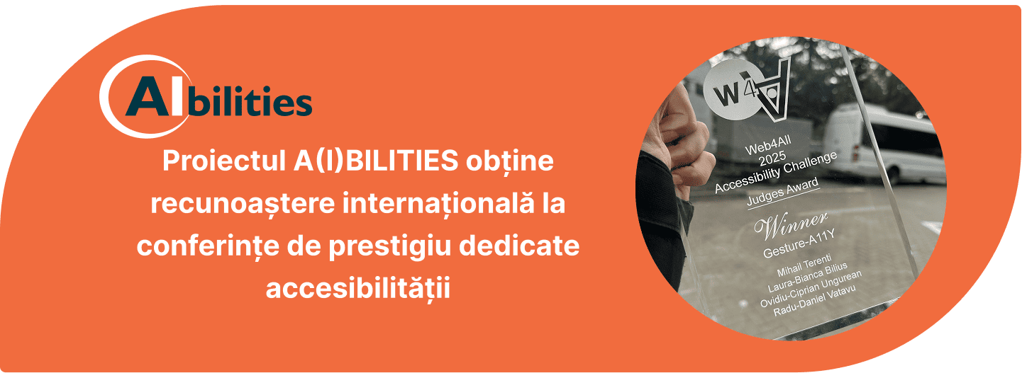 În ultimele luni, echipa de proiect — în special reprezentanții laboratorului MintViz din cadrul Universității „Ștefan cel Mare” din Suceava — a participat la evenimente academice și profesionale de referință, precum CHI 2025 (ACM Conference on Human Factors in Computing Systems) și W4A ’25 (a 22-a ediție a conferinței internaționale Web for All). În cadrul aceste evenimente au fost prezentate rezultatele cercetărilor derulate în cadrul A(I)BILITIES, aflate la intersecția dintre inteligența artificială, accesibilitate și design incluziv.